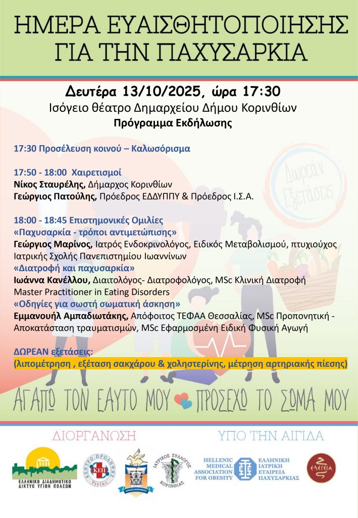 Ο Δήμος Κορινθίων, το ΚΕΠ Υγείας και το Ελληνικό Διαδημοτικό Δίκτυο Υγιών Πόλεων του Παγκόσμιου Οργανισμού Υγείας (ΕΔ ΔΥΠ ΠΟΥ) συνδιοργανώνουν εκδήλωση αφιερωμένη στην Ημέρα Ευαισθητοποίησης για την Παχυσαρκία, τη Δευτέρα 13 Οκτωβρίου 2025 και ώρα 17:30, στο μικρό θεατράκι του Δημαρχείου.