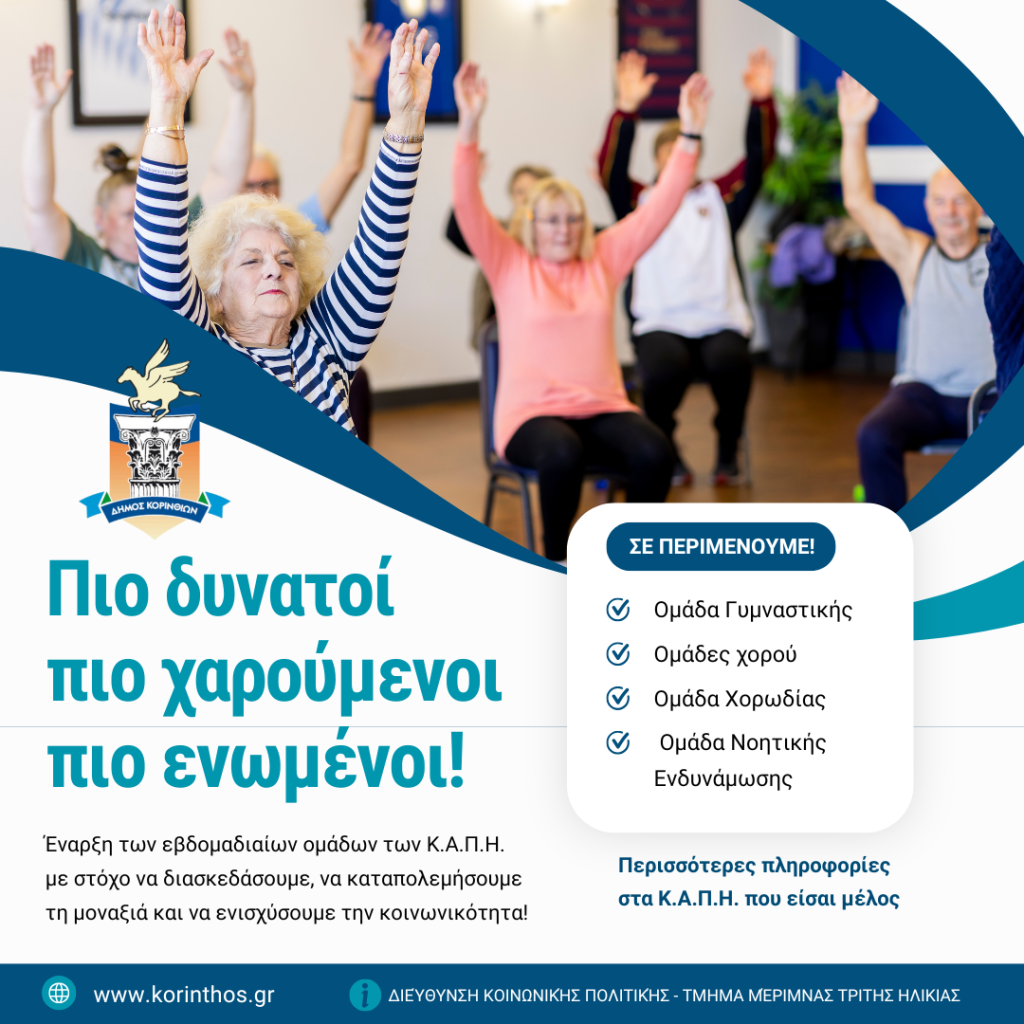 Με αφορμή τη Παγκόσμια Ημέρα για την Τρίτη Ηλικία, τη Τετάρτη 1 η Οκτωβρίου 2025 το Τμήμα Μέριμνας Τρίτης Ηλικίας του Δήμου Κορινθίων ανακοινώνει την έναρξη των εβδομαδιαίων ομάδων των Κ.Α.Π.Η. με στόχο να διασκεδάσουμε, να καταπολεμήσουμε τη μοναξιά και να ενισχύσουμε την κοινωνικότητα!