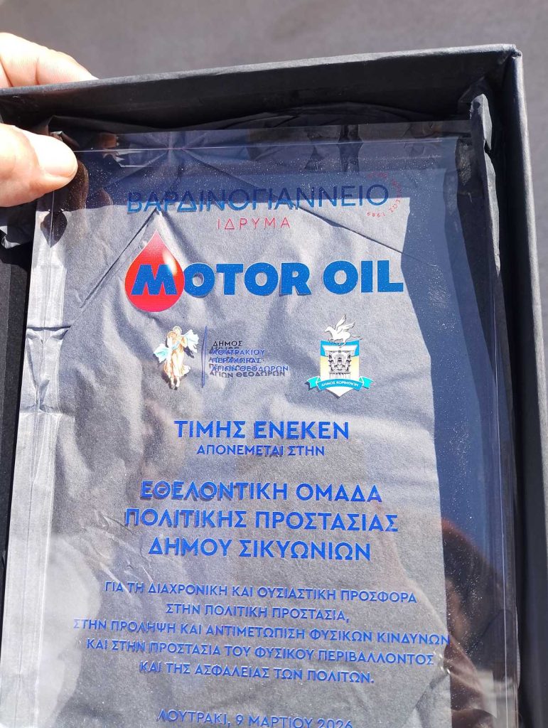Η Δευτέρα 9 Μαρτίου 2026 αποτέλεσε μια ημέρα ιδιαίτερης ηθικής ικανοποίησης για τον Δήμο Σικυωνίων, καθώς στο πλαίσιο της εκδήλωσης που πραγματοποιήθηκε στο Αλεξάνδρειο Συνεδριακό Κέντρο στο Λουτράκι, η Motor Oil και το Βαρδινογιάννειο Ίδρυμα βράβευσαν την Εθελοντική Ομάδα Πολιτικής Προστασίας του Δήμου μας.