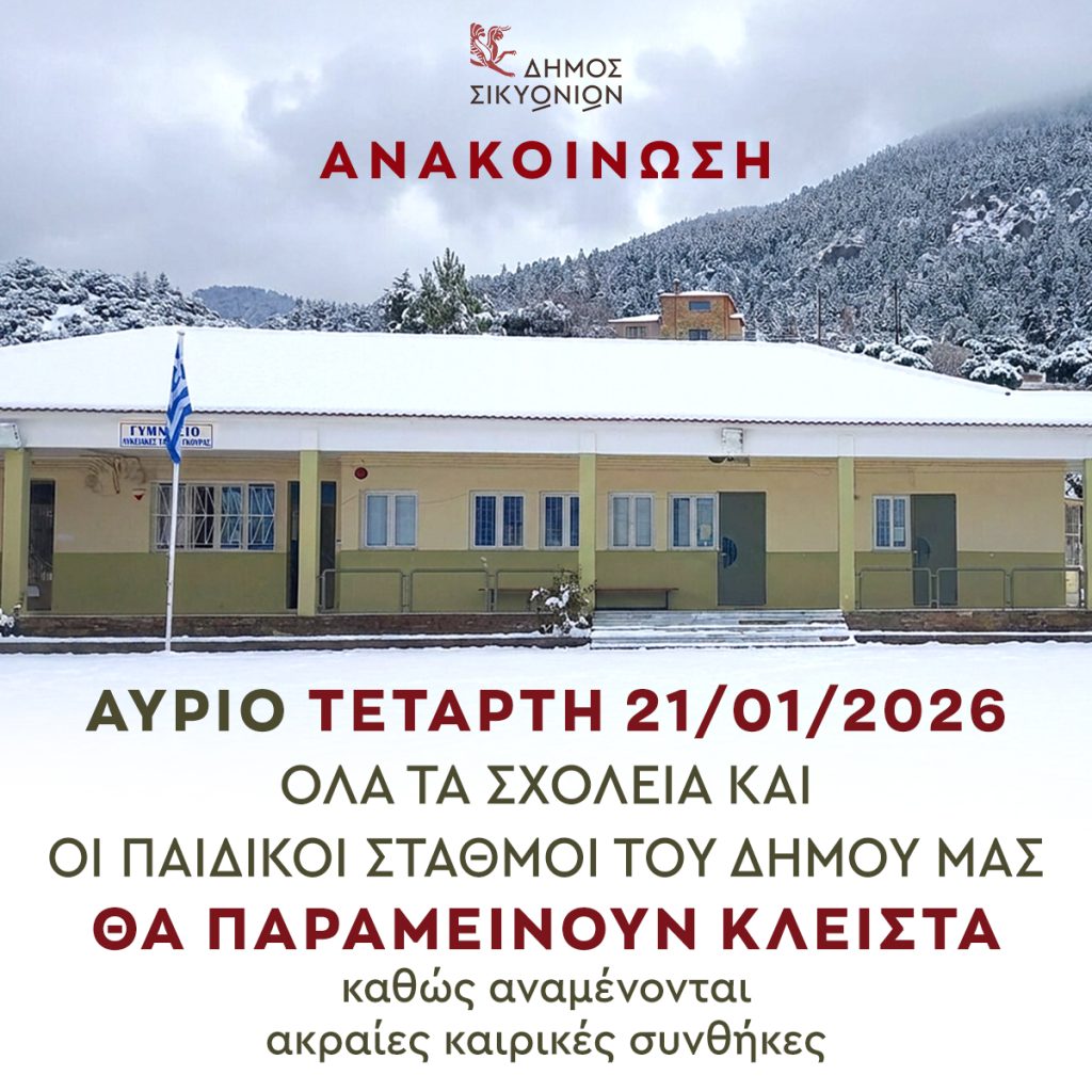 Λόγω των αναμενόμενων ακραίων καιρικών φαινομένων που θα επικρατήσουν στην περιοχή, αύριο 𝝩𝝚𝝩𝝖𝝦𝝩𝝜 𝟮𝟭 𝝞𝝖𝝢𝝤𝝪𝝖𝝦𝝞𝝤𝝪 𝟮𝟬𝟮𝟲, όλα τα Σχολεία και οι Παιδικοί Σταθμοί 𝝝𝝖 𝝥𝝖𝝦𝝖𝝡𝝚𝝞𝝢𝝤𝝪𝝢 𝝟𝝠𝝚𝝞𝝨𝝩𝝖.
