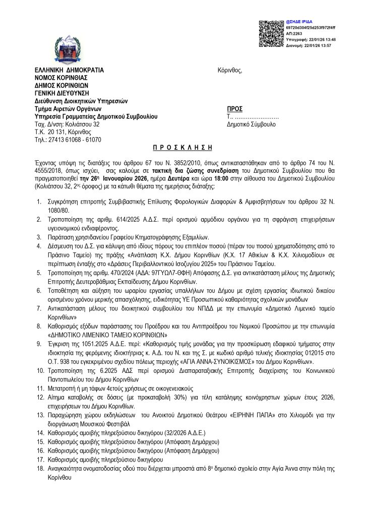 Επικαιρότητα Με 21 θέματα συνεδριάζει την Δευτέρα 26/1 το Δημοτικό Συμβούλιο Κορινθίων 23 Ιανουαρίου, 2026 Sotiris B. Social spread