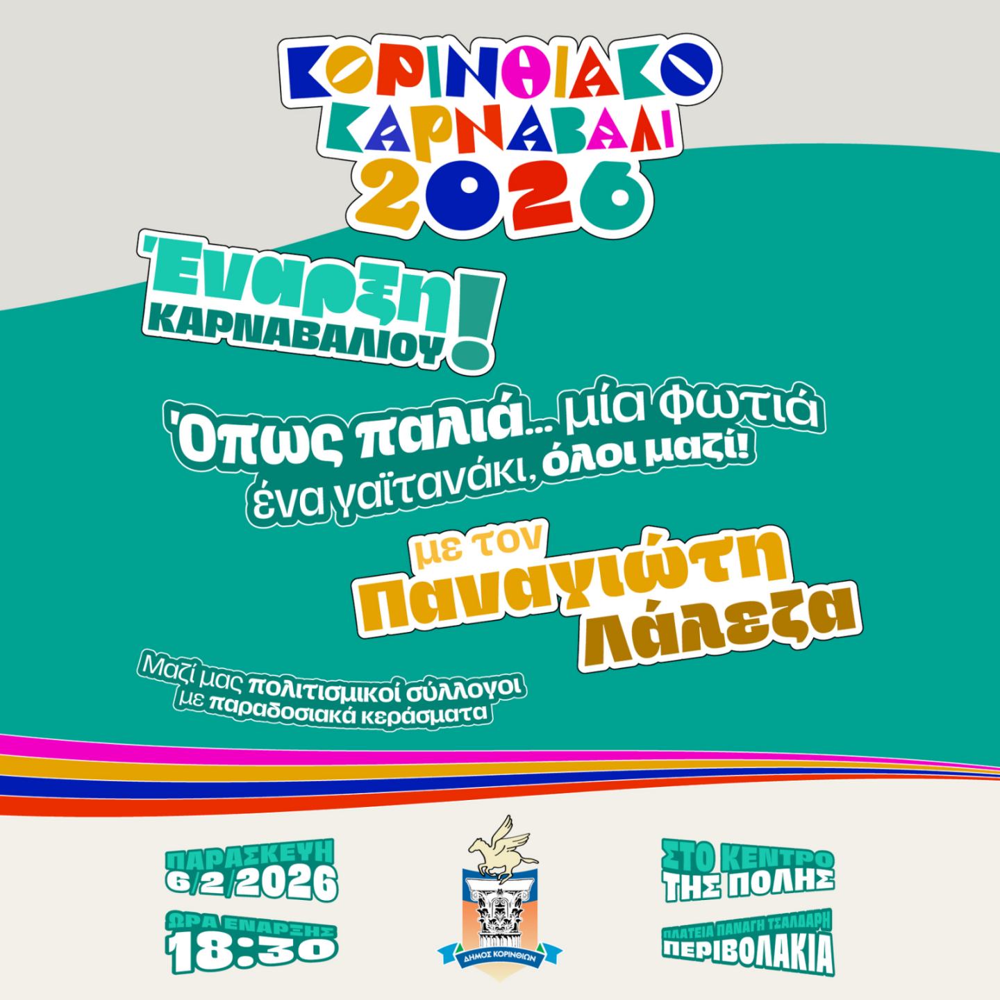 Η Κόρινθος φοράει τα γιορτινά της και ανοίγει διάπλατα την πόρτα στη χαρά, στη μουσική και στη συμμετοχή. Ο Δήμος Κορινθίων κηρύσσει την πανηγυρική έναρξη των καρναβαλικών εκδηλώσεων