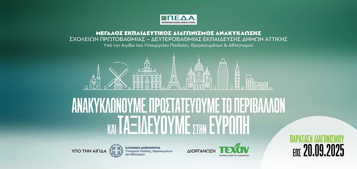 Λόγω της εντυπωσιακής συμμετοχής και των αυξημένων αιτημάτων από σχολεία της Περιφέρειας, παρατείνεται η διάρκεια του Μεγάλου Εκπαιδευτικού Διαγωνισμού Ανακύκλωσης για σχολεία Πρωτοβάθμιας και Δευτεροβάθμιας Εκπαίδευσης μέχρι και τις 20 Σεπτεμβρίου 2025.