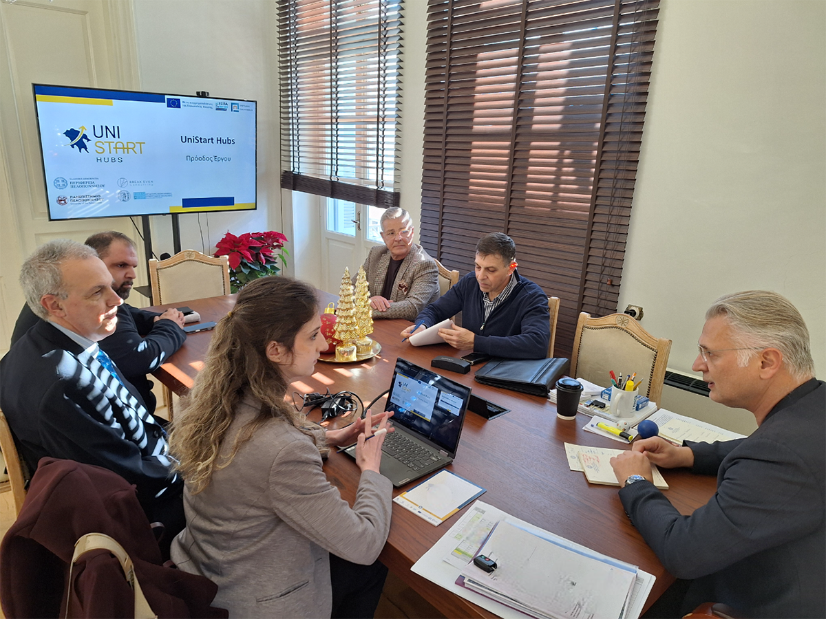 Συνάντηση εργασίας πραγματοποιήθηκε με τη συμμετοχή του Περιφερειάρχη Πελοποννήσου Δημήτρη Πτωχού, του Πρύτανη του Πανεπιστημίου Πελοποννήσου Καθηγητή Αθανάσιου Κατσή, του Αντιπεριφερειάρχη Επιχειρηματικότητας Σωτήρη Μουρίκη, του Προϊσταμένου της ΕΥΔ Αντώνη Ψαράκη και της εταιρείας υλοποίησης με αντικείμενο τον σχεδιασμό των επόμενων δράσεων του προγράμματος UniStart Hubs.