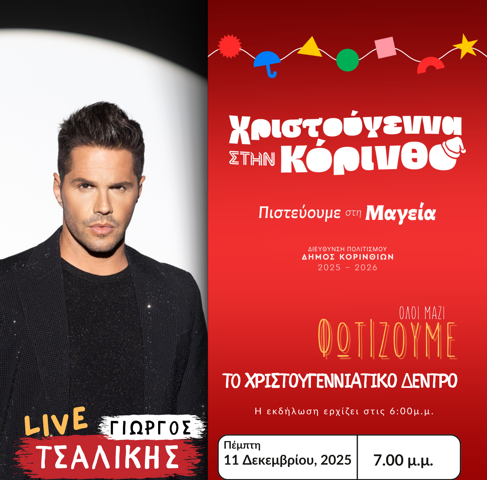 Λίγο αργότερα, στις 7.00, τη σκηνή αναλαμβάνει ο αγαπημένος Γιώργος Τσαλίκης, σε μια συναυλία γεμάτη ρυθμό, χαμόγελα και γιορτινή διάθεση που υπόσχεται να ξεσηκώσει όλη την Κόρινθο. Μουσική, φως και ζεστή ατμόσφαιρα θα δώσουν το σύνθημα για την έναρξη των πιο λαμπερών Χριστουγέννων των τελευταίων ετών.